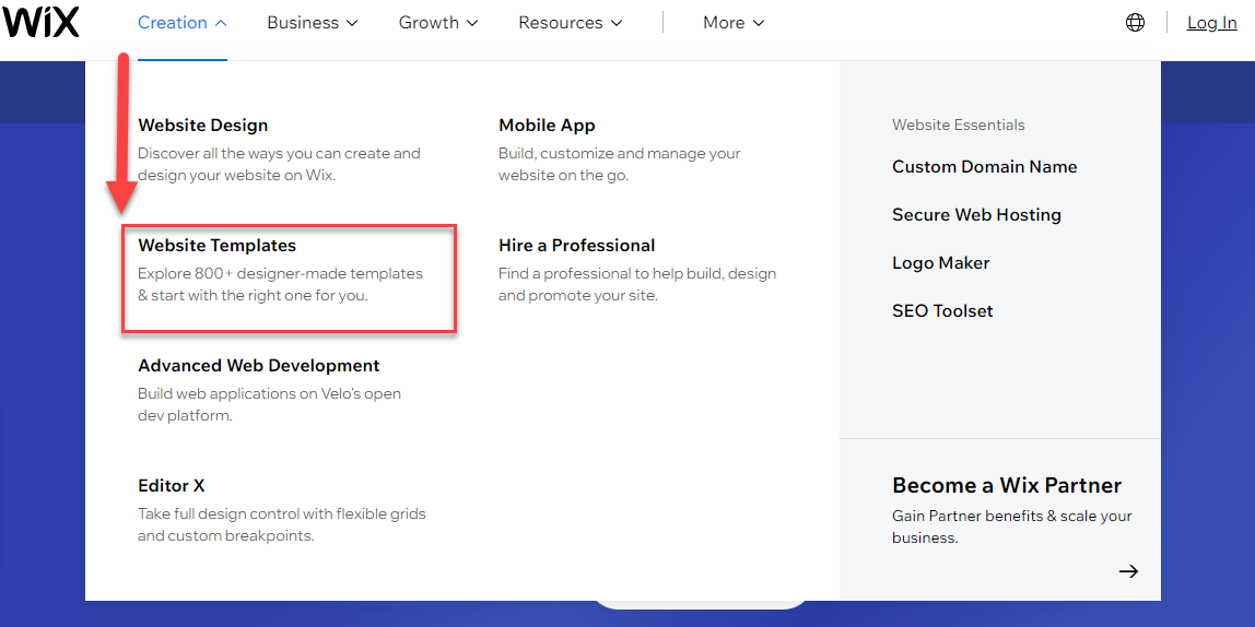 Se você estiver interessado em usar modelos WIX, primeiro vá para o Wix.com. Quando estiver lá, procure o ‘Criação‘Opção e clique nela. Um pop-up deve aparecer logo depois. Neste pop-up, você vai querer selecionar ‘Modelos de sites. ‘ E aí está – você está pronto para explorar a ampla gama de modelos da Wix.